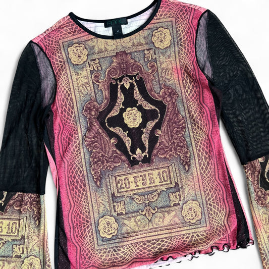 90s Y2K Anac Sheer Psychedelic Longsleeve Mesh Top Flared Sleeves Lettuce Hem Women’s Med