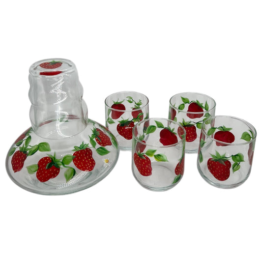 Vintage Hand Painted Strawberry Water Carafe Set & Drinking Glasses