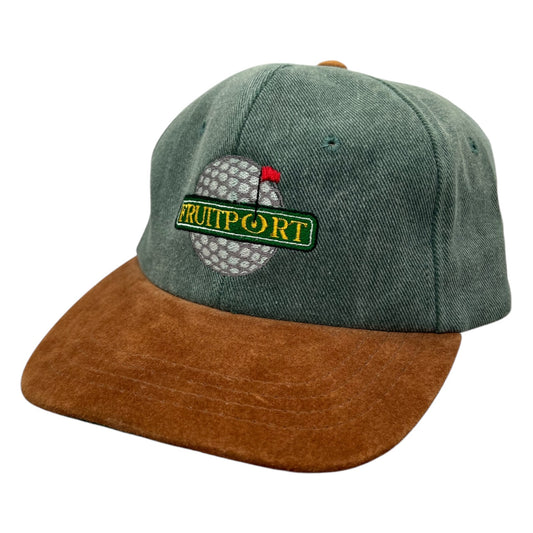 Vintage 90s Fruitport Golf Cap Green Canvas Brown Suede Brim One Size Made in USA