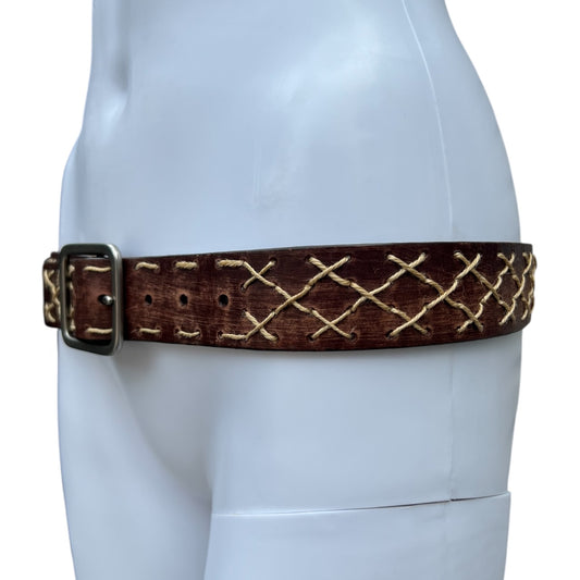 Y2K Buckle Brown Leather Western Belt Embroidered Rope Detail Women’s Med