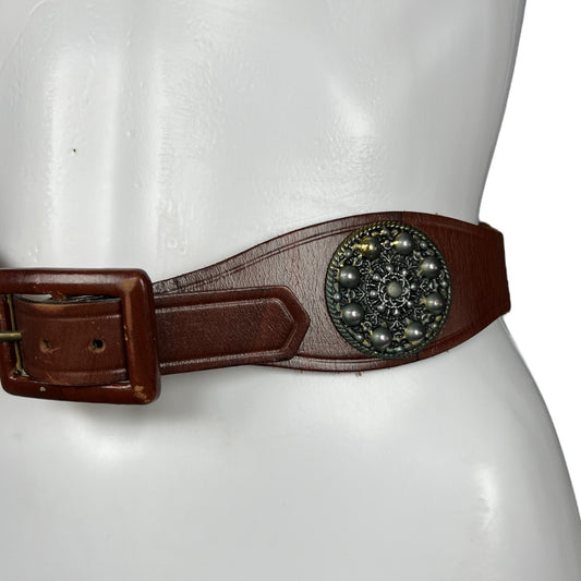 Vintage Garay Brown Genuine Leather High Waist Concho Medallion Belt Women’s Size 28