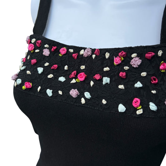 90s Y2K Belldini Black Knit Tank Floral Ribbon Lace Detail Women’s Med