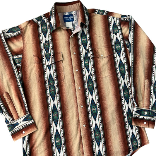 Vintage Wrangler Western Shirt Pearl Snap Brown Aztec Print Longsleeve Men’s Large