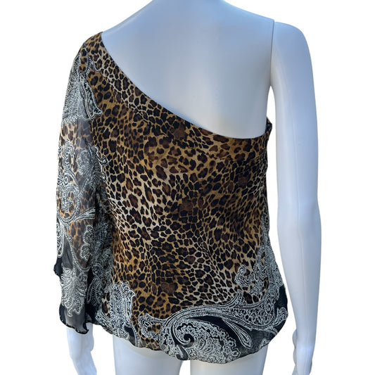 Y2K Caché Silk Chiffon Cold Shoulder Blouse Beaded Leopard Print Paisley Women’s Med
