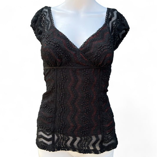 90s Y2K Studio Y Black Floral Lace Blouse Puff Sleeve Waist Tie Women’s Small
