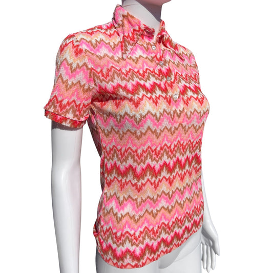 70s Pink Psychedelic Flame Stitch Knit Dagger Collar Polo Shirt Sheer Women’s Small