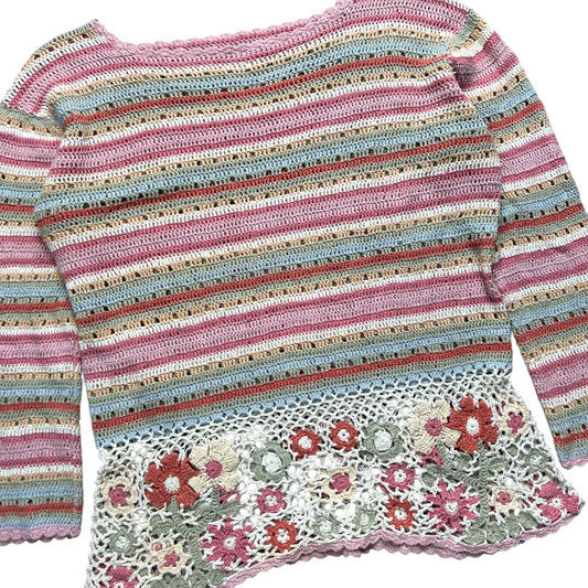 Vintage Y2K Boho floral Crotchet Pastel Striped Sweater Women’s XL