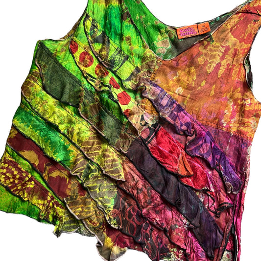 Y2K Chic Thing Silk Tie Die Ruffle Patchwork Tank Top Floral Polka Dot Print Women’s Small Boho Hippie