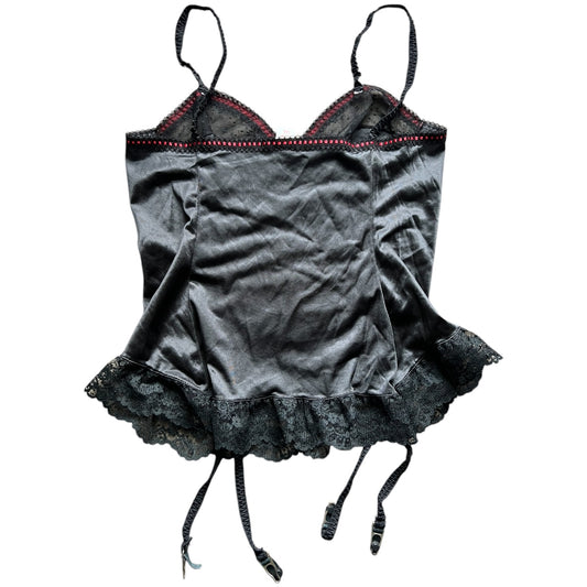 Vintage 80s Black Satin Camisole Polka Dot Floral Lace Women’s Large Made in USA
