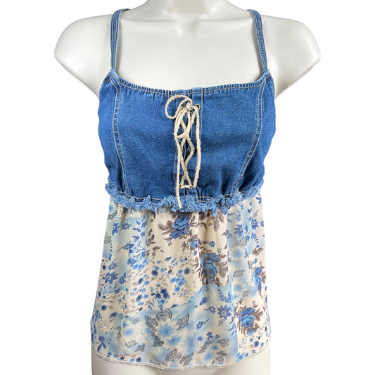 Vintage Y2K Zoey Beth Denim Tank Top Lace Up Detail Semi Sheer Floral Bottom Women’s Med