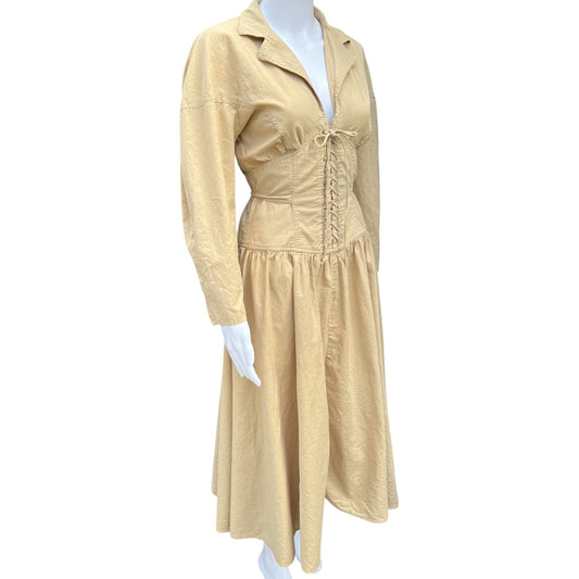 90s Fred Charles Tan Lace Up Corset Midi Dress Notch Collar Women’s 7 100% Cotton