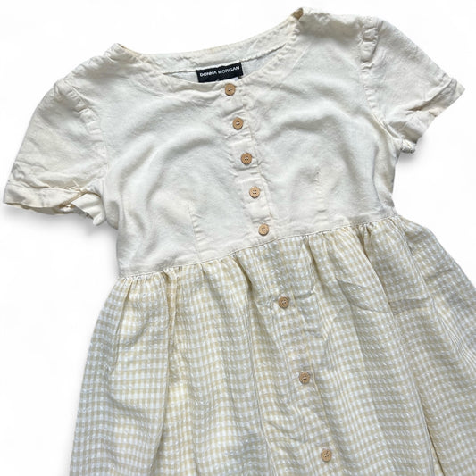 80s 90s Donna Morgan Cottagecore Short Sleeve Peasant Dress Button Up Cream Gingham Waist Tie Women’s 8