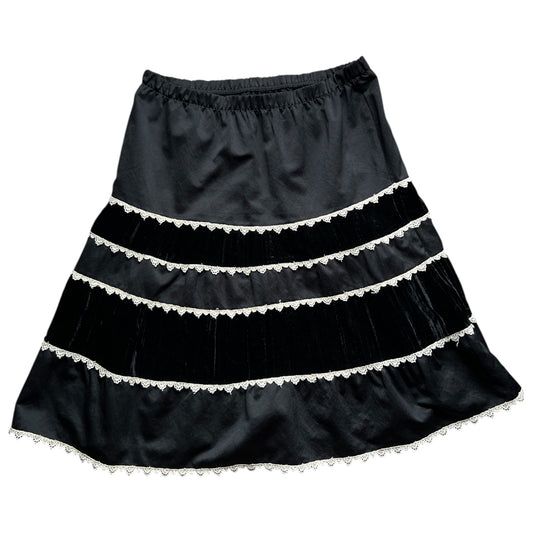 90s Y2K Mossimo Black Velvet Tiered A-Line Midi Skirt Women’s Med Lace Trim