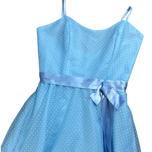 Vintage 80s Dance Allure Blue Polka Dot Spaghetti Strap Sheer Maxi Dress Layered Ruffle Women’s XS / S