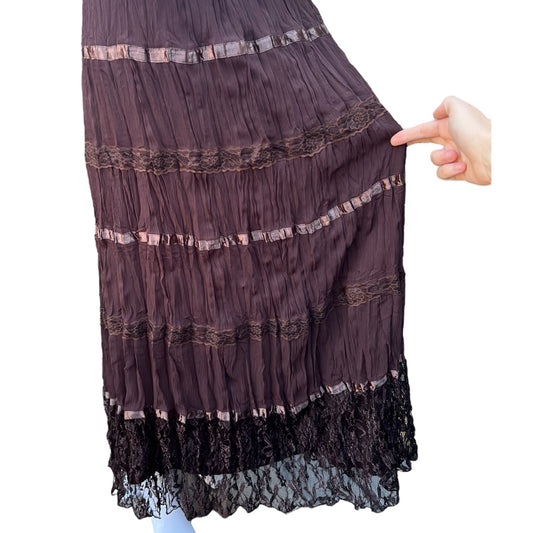 90s Y2K Brown Boho Tiered Crinkle Maxi Skirt Ribbon Floral Lace Trim Women’s 14/16W