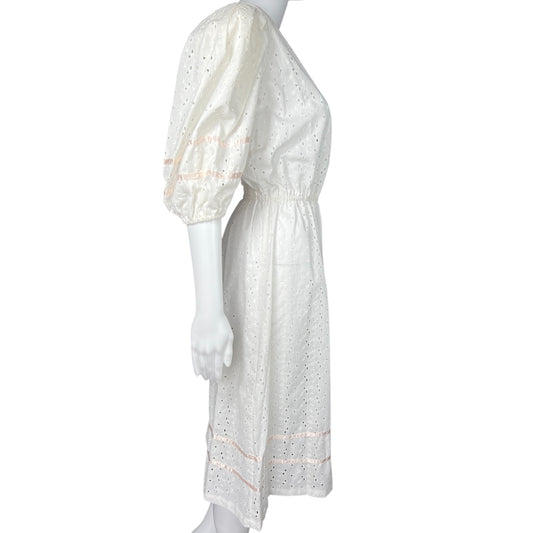 Vintage 1970s Seneca White Eyelet Floral Lace Prairie Midi Dress Puff Sleeves Pink Ribbon Women’s Small