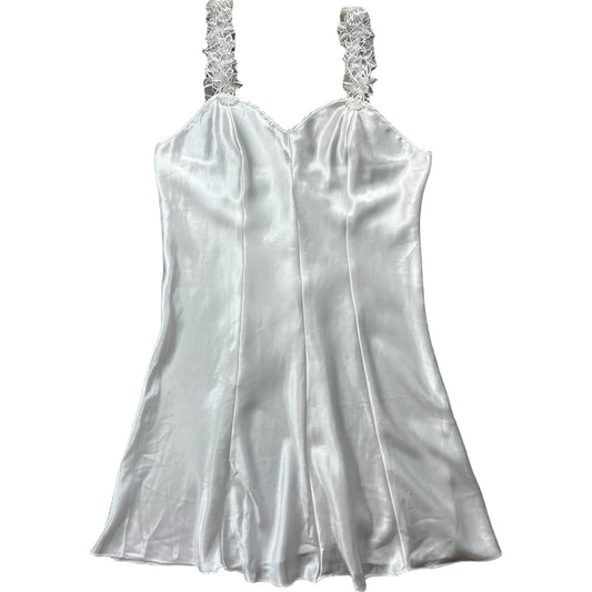 Vintage 80s 90s Intimate Affair White Satin Bridal Slip Dress Sheer Floral Lace Straps Beaded Faux Pearls Women’s Large