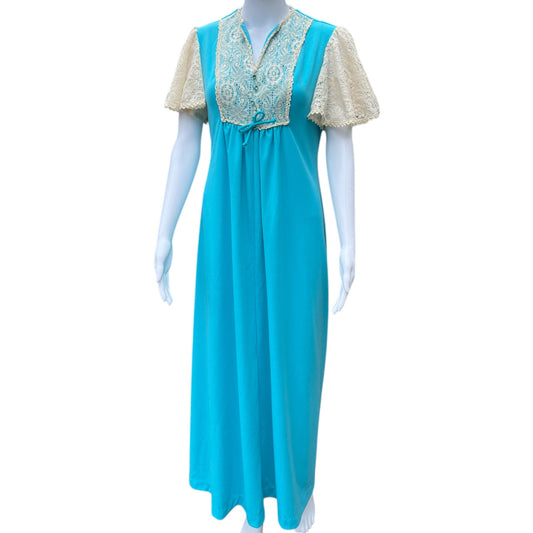 70s Handmade Turquoise Cottagecore Maxi Dress Flutter Sleeves Lace Trim Women’s 13/14 Made in USA