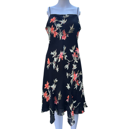 90s Y2K Lily Black Floral Chiffon Midi Dress Handkerchief Hem Women’s Large Made in USA