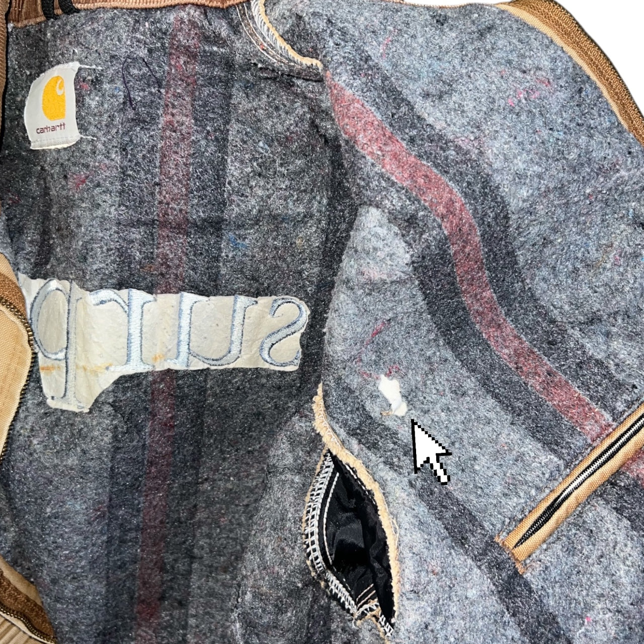 light distressing to wrists as well, a hole can be found on the inner blanket lining. Chest pocket zipper still functional but missing its pull.